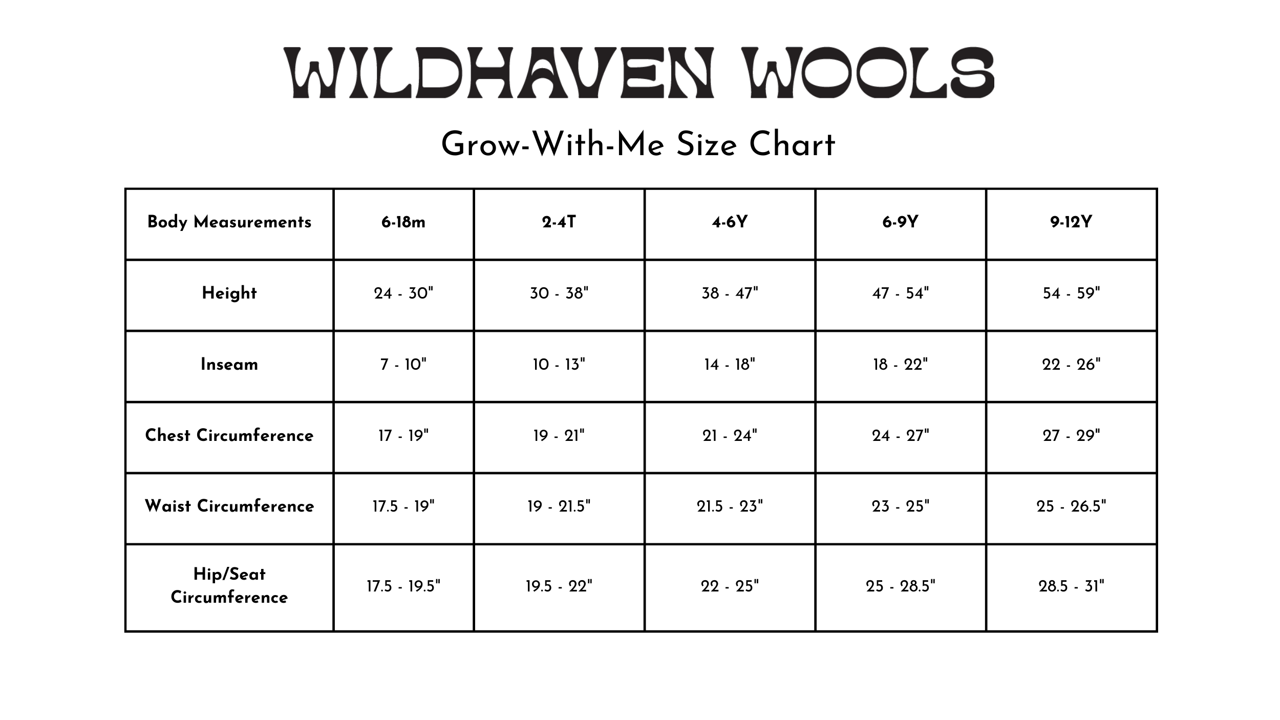 Our signature wool sets are made in grow-with-me sizes rather than conventional kids' clothing sizes. This means we make only 5 sizes, each one designed to last for several years (eg 2-4T). Please use the size chart below to determine the best size for your child.